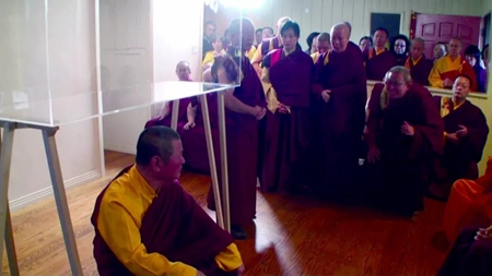 第二天我又到蒙特利市的庙上,见到正学法师等比丘尼,我又再次问及她帮我将电话转给见慧法师的时候,她在哪个地方?正学法师一听,非常生气说:“明明我昨天就跟你说了我在庙上,怎么今天还问?”让我马上跟她到三圣殿去,她一进去“乒砰”一声就跪在阿弥陀佛、观世音菩萨、大势至菩萨佛像前,举起手来就发下了毒誓,说:“佛弟子释正学,今在三圣殿,面对阿弥陀佛、观世音菩萨、大势至菩萨、所有的诸佛菩萨、护法面前郑重地发誓,昨天整个修法的过程,有禄东赞法王、见慧法师,还有包括我在内有六位出家人跟一位居士,整个修法的过程,从头到尾,自始自终都没有任何一个人离开庙子,再来,正慧法师打电话给我,要我找见慧法师听电话,电话是我接的,就在庙子里接的,是我亲自拿给见慧法师,我还听到见慧法师告诉正慧法师说她会尽快回去,以上所言,若有半句谎言,释正学必堕无间地狱,受尽一切痛苦,若有任何的功德,回向六道有情众生,愿众生能得闻正法,修行解脱,阿弥陀佛!”
